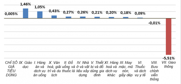 Giá hàng hóa, dịch vụ tiêu dùng thiết yếu tăng theo giá nguyên liệu đầu vào và bước sang năm học mới 2022-2023, học phí giáo dục tại một số địa phương tăng trở lại, tuy nhiên giá xăng dầu trong nước liên tục được điều chỉnh giảm từ tháng 7/2022 đã làm cho chỉ số giá tiêu dùng (CPI) tháng 8/2022 chỉ tăng nhẹ 0,005% so với tháng trước. So với tháng 12/2021, CPI tháng Tám tăng 3,6% và so với cùng kỳ năm trước tăng 2,89%.