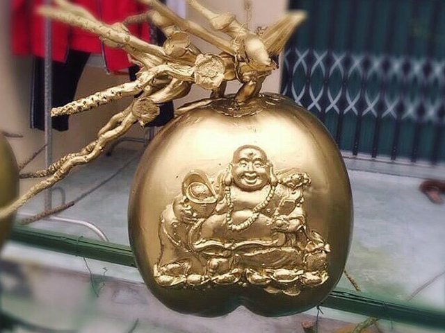 Bên cạnh những quả dừa in chữ thư pháp hay điêu khắc hình linh vật, thị trường Tết Nguyên đán năm nay còn xuất hiện loại dừa vẽ hình tượng Phật mới lạ. Nhờ vậy, dân buôn bán lên đến ngàn quả dịp này.