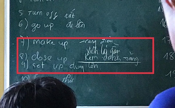 Cụ thể, cậu bạn này được gọi lên bảng làm bài trong giờ tiếng Anh. Bài tập vốn không quá khó, chỉ là viết nghĩa của các động từ ghép như: "Turn off", "go up", "make up", "close up", "set up",... Đây đều là những cụm động từ đơn giản, được sử dụng phổ biến.