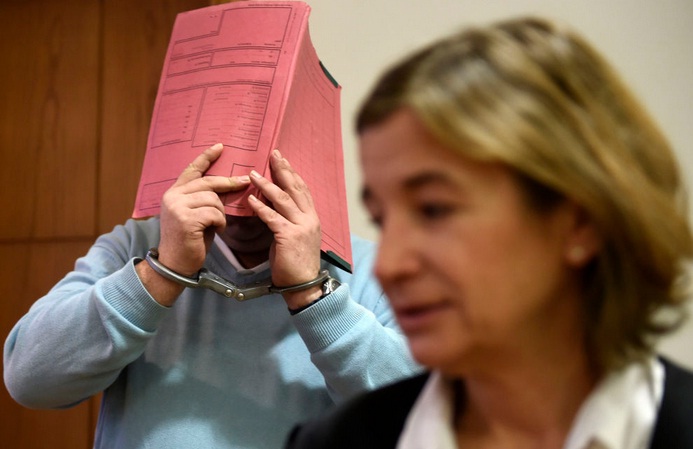 Phạm nhân Niels H. (trái) che mặt khi ra hầu tòa tại Oldenburg ngày 9.12.2014. Ảnh: Reuters