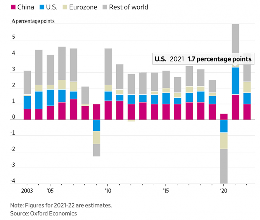 Vì nền kinh tế Mỹ lớn hơn Trung Quốc khoảng một phần ba, đóng góp của nó vào tăng trưởng toàn cầu sẽ lớn hơn của Trung Quốc nếu cả hai đều tăng trưởng xấp xỉ với tốc độ như nhau trong năm nay.