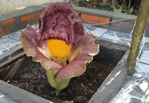 Ông Danh Tóc (84 tuổi) ở xã Giục Tượng, huyện Châu Thành (tỉnh Kiên Giang) cuối tuần trước phát hiện nụ hoa lạ cạnh hàng rào trước sân nhà. Hai hôm nay cây hoa nở lớn dần, không có lá, cao khoảng 30 cm, tán rộng 30 cm, đài hoa hình loa kèn, nhuỵ rất dài. Gia chủ xây bệ gạch bao quanh để bảo vệ hoa.