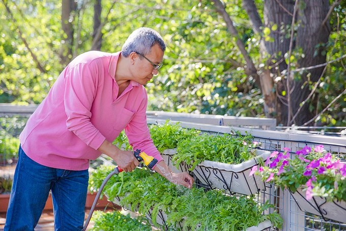 Vườn cây xanh trên sân thượng được tưới bằng công nghệ phun vi sinh. Ngoài bảo vệ ngôi nhà mát mẻ, vườn trên mái còn ẩn giấu nhiều bí ẩn, đó là hệ thống thu gom nước mưa, công nghệ phun vi sinh giúp tiết kiệm nước và hệ thống xử lý phân được sử dụng để trồng rau và hoa... theo các cách bảo vệ môi trường bền vững.