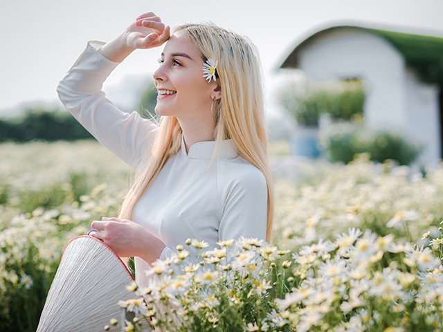 Hình ảnh những thiếu nữ nước ngoài trong trang phục áo dài truyền thống của Việt Nam bên cánh đồng cúc họa mi ở Thảo Nguyên Hoa Long Biên khi ghé thăm Hà Nội đã tôn thêm vẻ đẹp duyên dáng, nữ tính của người phụ nữ.