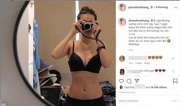 Vượt qua các mỹ nhân Việt với vòng eo 53cm như Ngọc Trinh, Chi Pu, Ninh Dương Lan Ngọc, siêu mẫu Thanh Hằng khoe giảm 4kg và vòng eo xuống còn 51cm.