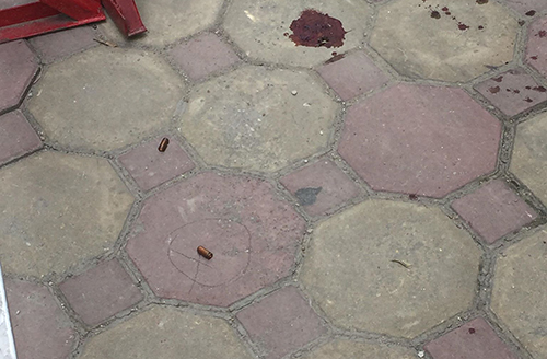 Tại hiện trường, trên vỉa hè có hai vỏ đạn và vệt máu. Cảnh sát sau đó đã phong toả để khám nghiệm hiện trường.