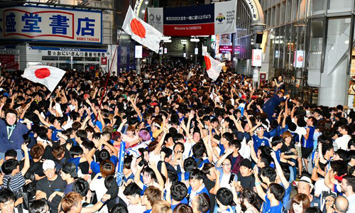 Các cổ động viên Nhật Bản tại khu Shibuya, trung tâm thủ đô Tokyo, ăn mừng sau khi đội tuyển vượt qua vòng bảng World Cup 2018. Ảnh: Asahi.
