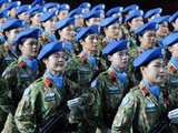 Khối Nữ Gìn giữ hòa bình Việt Nam trong đêm tổng hợp luyện diễu binh, diễu hành 22/4.