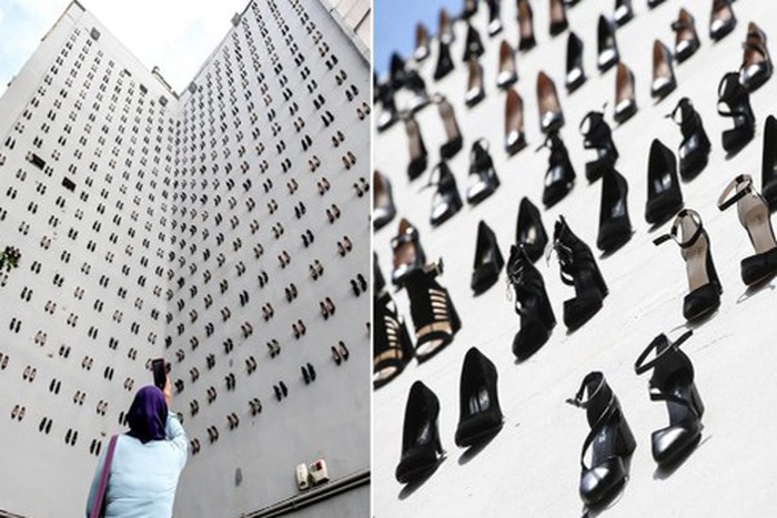 Hàng trăm đôi giày cao gót màu đen được xếp ngay ngắn, thẳng hàng trên hai bức tường như lời tố cáo đanh thép cho tội ác mà bạo lực gia đình gây ra. Đồng thời, tác phẩm nghệ thuật còn là lời cảnh tỉnh con người về sự nguy hiểm của tội ác này.