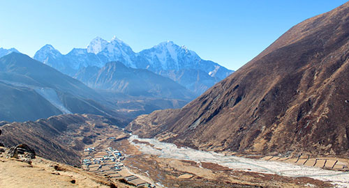 Cảnh tượng hùng vỹ của những đỉnh núi cao hơn 8.000m và dòng sông băng Tsola bao quanh một ngôi làng nhỏ nằm ở thung lũng cùng tên Pheriche mà tộc người Sherpa đang sinh sống, ở độ cao 4.402m.