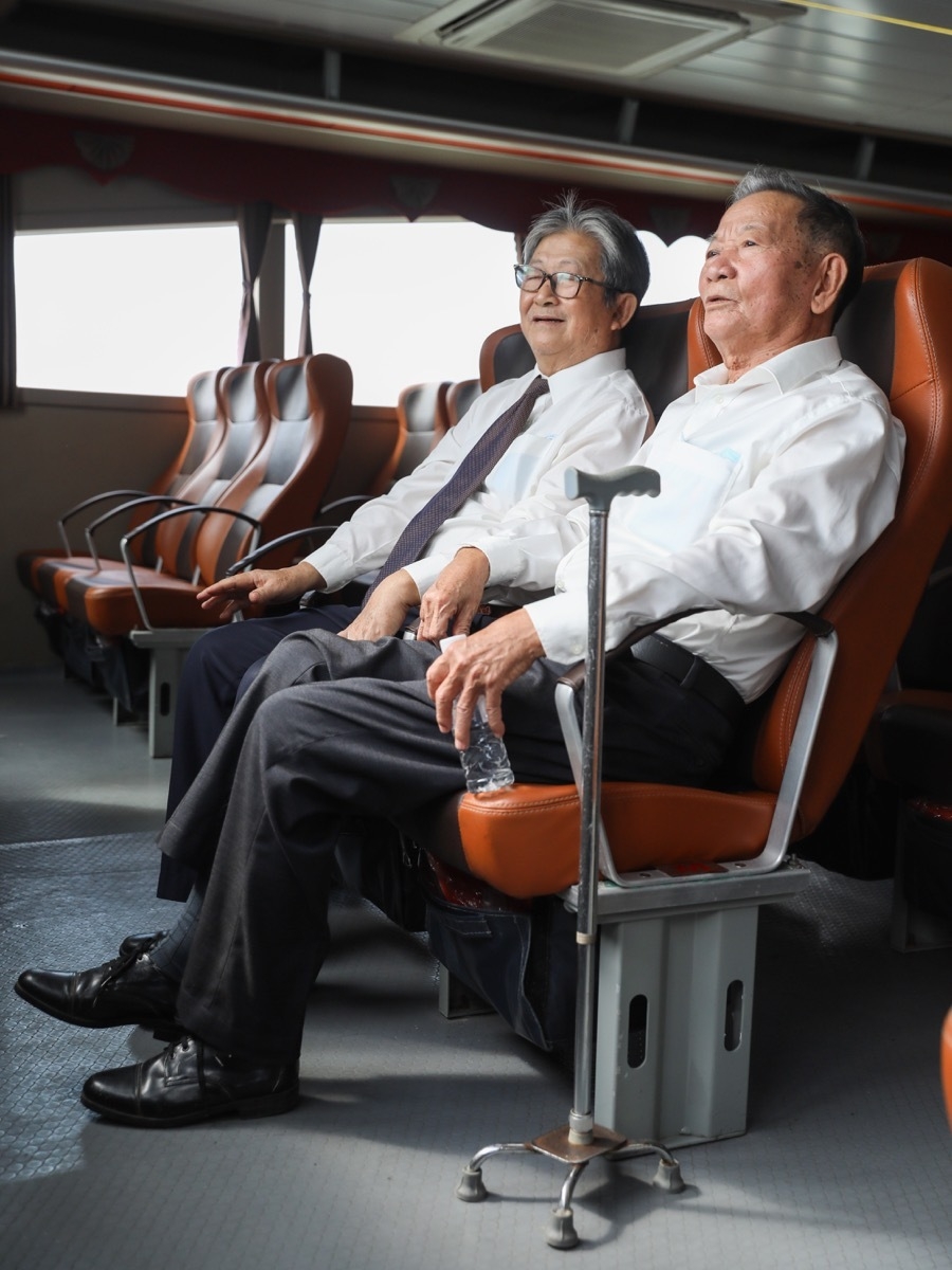 Ông Đoàn Ngọc Tuấn (ngoài cùng) chân bị đau phải chống gậy nhưng vẫn lên phà trải nghiệm, ngồi hàn huyên với bạn đi cùng. "Tôi sinh ra và lớn lên ở Cần Giờ, nhớ hồi trước muốn đi Vũng Tàu đều phải đi xe máy mất cả buổi sáng, rất mệt mỏi. Giờ có phà rồi tôi rất vui vì bà con được đi lại thuận tiện", ông lão 87 tuổi nói. |