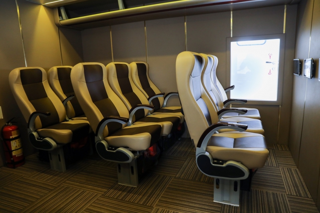 | Trong khoang phà còn có khu phòng VIP với hai dãy, mỗi dãy 9 ghế. Phía sau ghế được lắp thêm màn hình cho khách giải trí. |