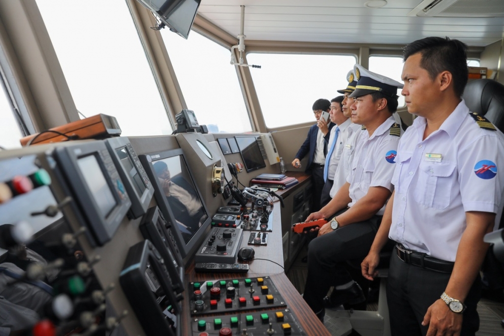 | Khu vực buồng lái phà thông thoáng. Theo thiết kế, phà chạy mất 30 phút cho quãng đường khoảng 15 km từ huyện Cần Giờ đến TP Vũng Tàu và ngược lại. |