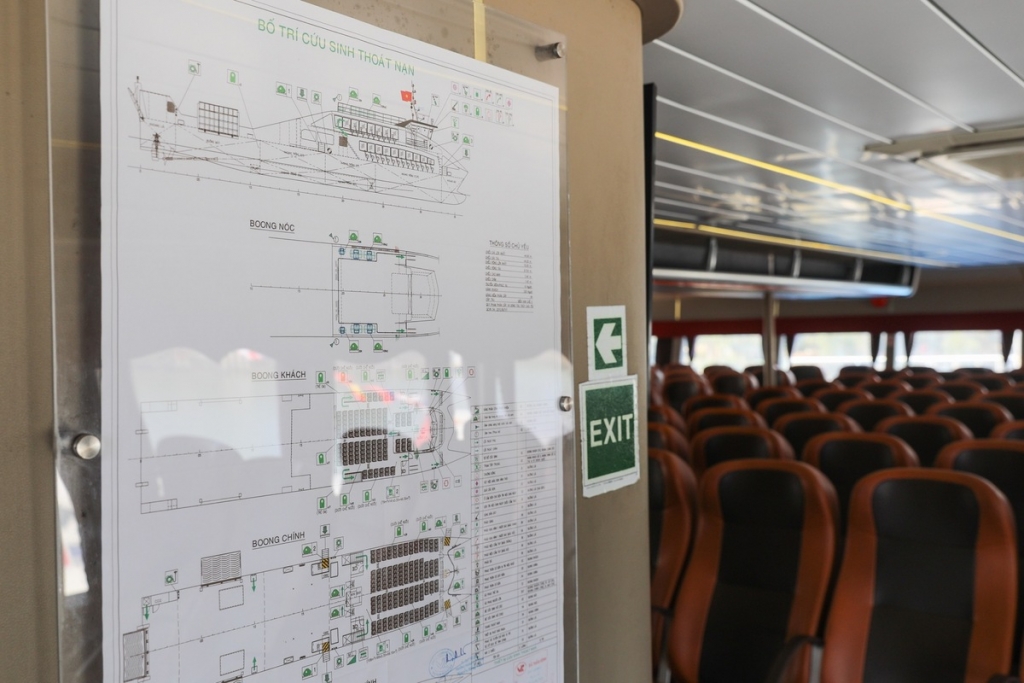 | Sơ đồ bố trí cứu sinh thoát nạn được dán chi tiết ở các lối thoát hiểm trong khoang phà. |