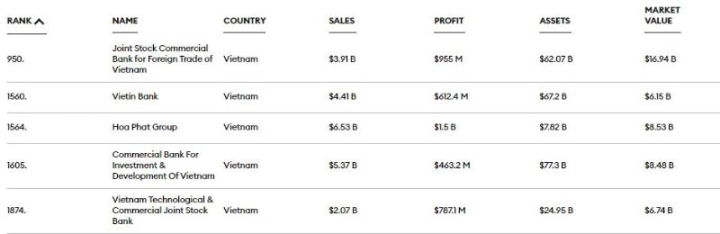 Ngoài Vietcombank, trong danh sách Global 2000 năm nay còn có 4 đơn vị khác của Việt Nam lần lượt có vị trí là 1.560, 1.564, 1.605 và 1.854.