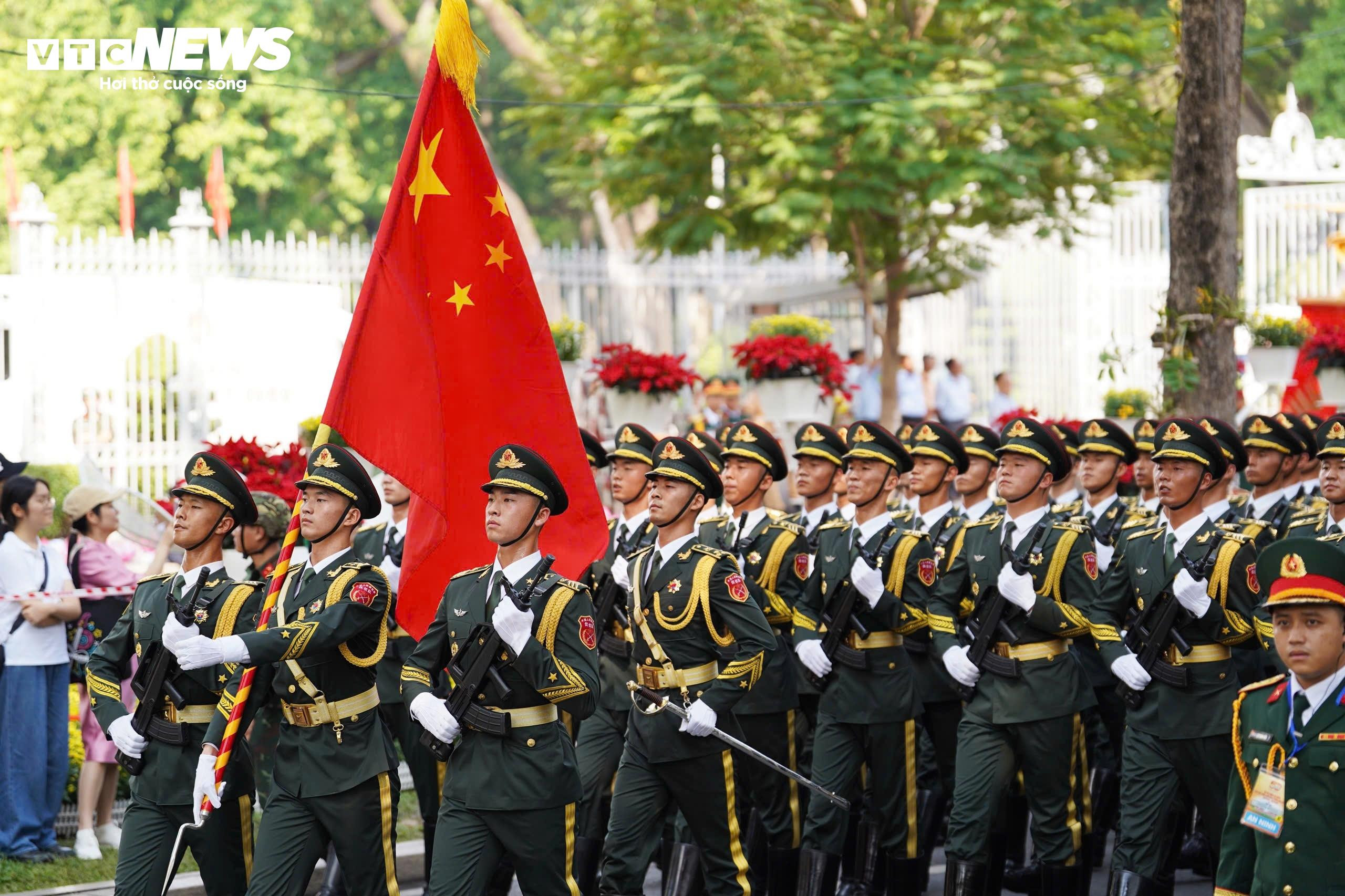 Vừa bước đi, các chiến sĩ trong Quân đội Trung Quốc vừa hát vang những ca từ ý nghĩa, xúc động trong bài hát 'Như có Bác Hồ trong ngày vui đại thắng'.