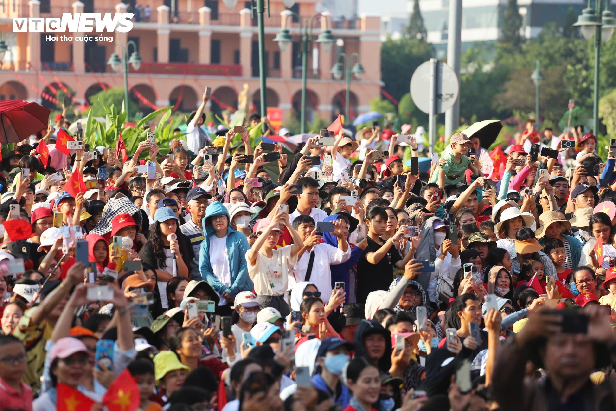 Hàng ngàn người dân vẫy cờ tổ quốc khi đón các lực lượng diễu binh tiến vào khu vực lễ đài.