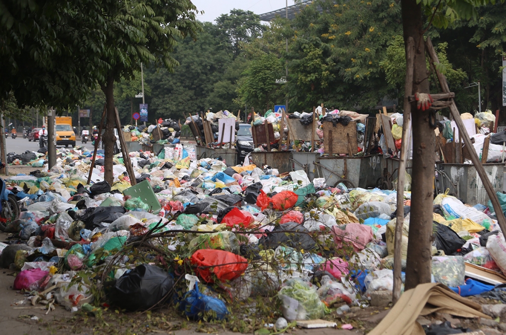 Năm ngày qua, nhiều tuyến phố ở quận Nam Từ Liêm rác tràn ngập đường, kéo dài hàng chục mét, bốc mùi hôi thối. |