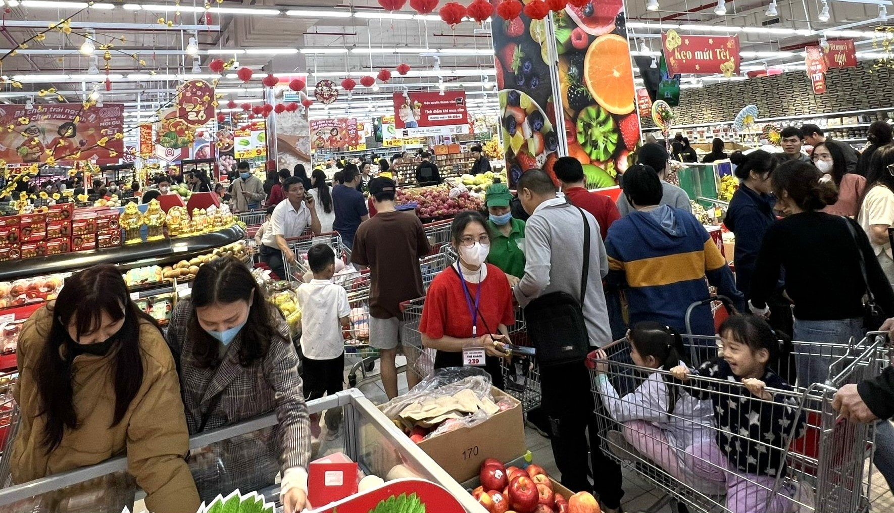 Tại các siêu thị lớn như AEON Việt Nam, WinMart, GO! hay Lotte Mart, Coopmart… khu vực thực phẩm tươi sống, đồ khô, bánh, mứt, nước giải khát luôn nhộn nhịp. Nhóm hàng phục vụ mâm cỗ Tết, như thịt gia súc, gia cầm, hải sản, rau củ quả, giò, chả, thực phẩm đông lạnh ghi nhận mức tiêu thụ tăng mạnh.