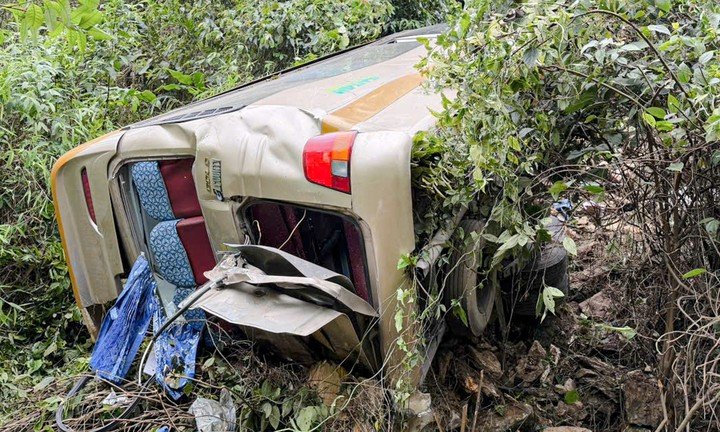 Khi đến Km 04+200, ô tô khách gặp đoạn đèo dốc quanh co, mặt đường hẹp, chỉ khoảng 2,5m. Do không thông thạo địa hình, tài xế không kiểm soát được tay lái, khiến xe lao xuống taluy âm sâu khoảng 100m.