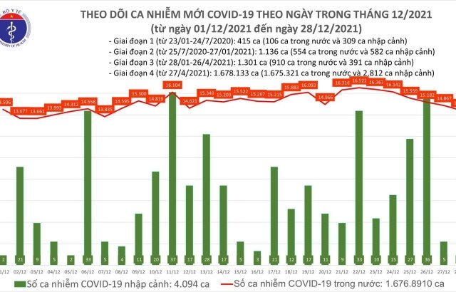 Chiều 27/12, Bộ Y tế công bố thêm 14.872 ca COVID-19, trong đó 14.867 ca ghi nhận trong nước.