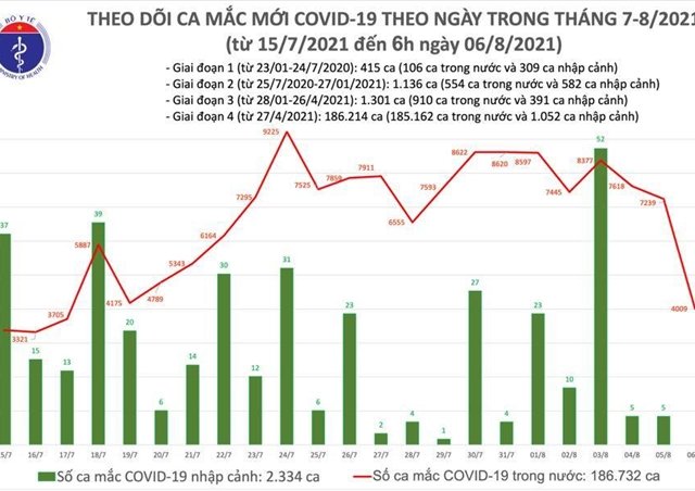 Sáng 6/8, theo thống kê của Bộ Y tế, Việt Nam thêm 4.009 ca COVID-19 ghi nhận trong nước.