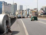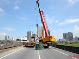 Xe chở cuộn thép văng rơi xuống đường Vành đai 3 trên cao gây vỡ mặt đường |