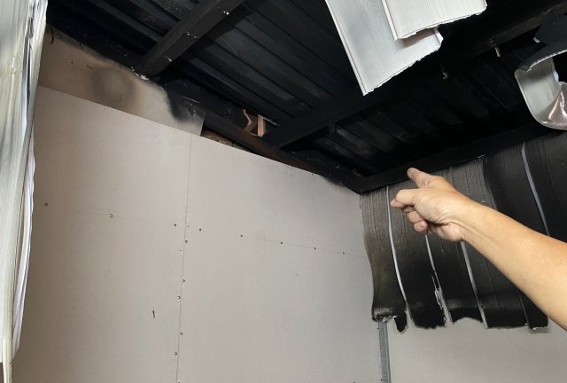 Đang nằm ngủ bỗng dưng nghe tiếng nổ kèm theo ngọn lửa bốc cháy trên trần nhà, bà T. hốt hoảng kéo theo con gái chạy ra khỏi nhà.