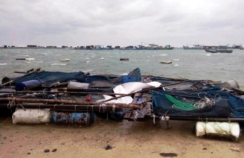 Bão số 15 kết hợp với gió mùa Đông Bắc khiến sóng cao khoảng 6 m, đánh vỡ nhiều bè nuôi tôm cá ở huyện đảo Phú Quý, Bình Thuận.