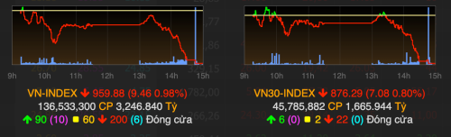 Đà bán mạnh cuối phiên kéo chỉ số đại diện Sở HoSE mất hơn 9 điểm, xuống dưới mốc 960 điểm.