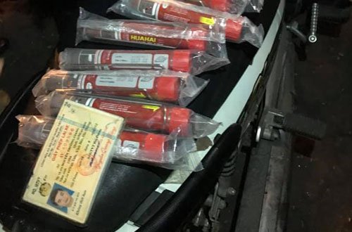 Cảnh sát 141 Hà Nội phát hiện Giang và Thủy có 30 quả pháo sáng trong cốp xe khi hòa vào dòng người hâm mộ đội tuyển Việt Nam.