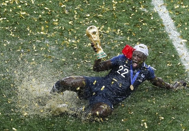 Cơn mưa bất chợt như tạo điều kiện cho các học trò của HLV Didier Deschamps có màn ăn mừng đặc biệt sau trận chung kết World Cup 2018.