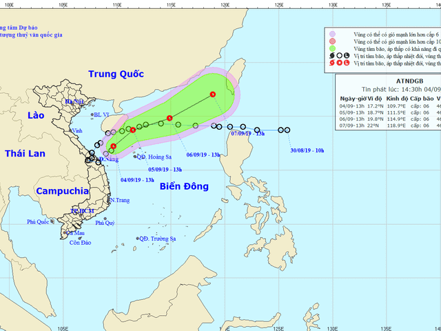 Hồi 13h ngày 4.9, vị trí tâm áp thấp nhiệt đới ở khoảng 17,2 độ Vĩ Bắc; 109,7 độ Kinh Đông, cách đất liền các tỉnh Quảng Trị-Quảng Ngãi khoảng 200km, giật cấp 8.