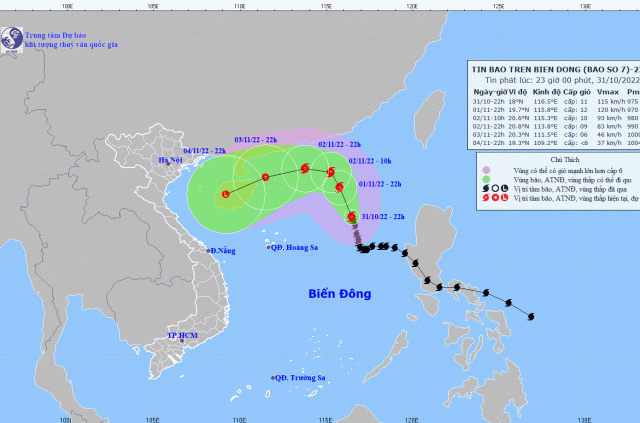 Theo Trung tâm Dự báo khí tượng thuỷ văn Quốc gia, 4h sáng nay 1/11, bão số 7 cách quần đảo Hoàng Sa khoảng 570km về phía Đông Đông Bắc.