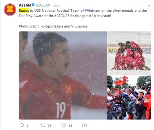Hiệp hội các Quốc gia Đông Nam Á chúc mừng đội tuyển U23 Việt Nam sau trận chung kết giải châu Á.