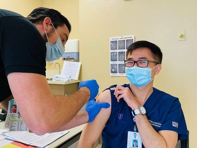 Bác sĩ Wynn Huỳnh Trần là một trong những nhân viên y tế đầu tiên tại Bệnh viện Methodist, California, tiêm vaccine Pfizer, cơ thể không phản ứng bất thường.