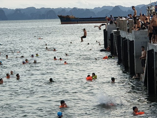 Dù bị nhắc nhở nhiều lần, có biển cấm tắm, những người dân Hạ Long chiều nào cũng đổ ra khu vực bờ biển Bến Đoan tắm biển. Do bờ kè quá cao nên người dân chế thang gỗ và dùng dây để đu xuống tắm biển bất chấp việc nơi đây từng có tai nạn chết người.