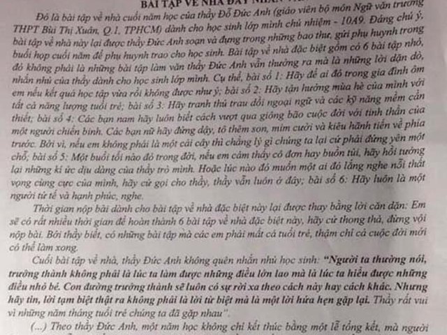 Lời nhắn gửi "Có những bài tập cả cuộc đời em mới làm xong" của thầy Đỗ Đức Anh (TP.HCM) vào đề thi Văn 10 tỉnh Bà Rịa - Vũng Tàu khiến học sinh thích thú.