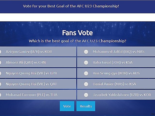 Trên website http://www.the-afc.com đang mở ra cuộc bình chọn bàn thắng đẹp nhất giải U23 Châu Á vừa qua. Tổng cộng có 10 bàn thắng được đưa vào danh sách bình chọn, tuy nhiên chỉ có 9 tác giả.