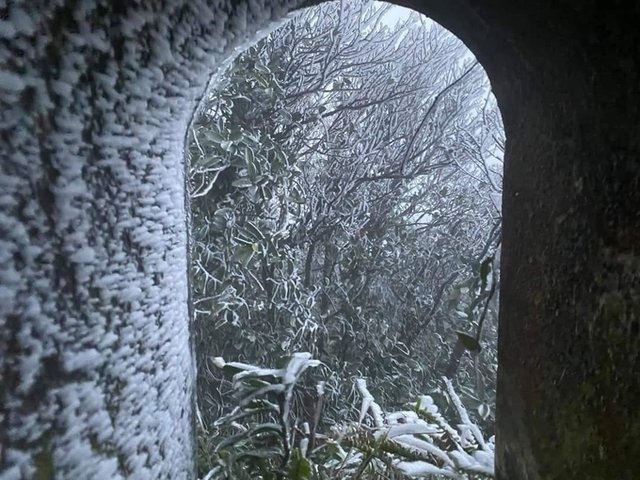 Sáng sớm 21/12, băng giá phủ một lớp trắng mỏng trên đỉnh Fansipan, do ảnh hưởng của không khí lạnh với mức nhiệt -9 độ C.