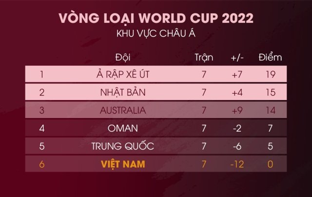 Đội tuyển Việt Nam đứng cuối bảng B vòng loại thứ ba World Cup 2022 khu vực châu Á với 4 điểm, ghi 8 bàn, để thủng lưới 19 bàn.