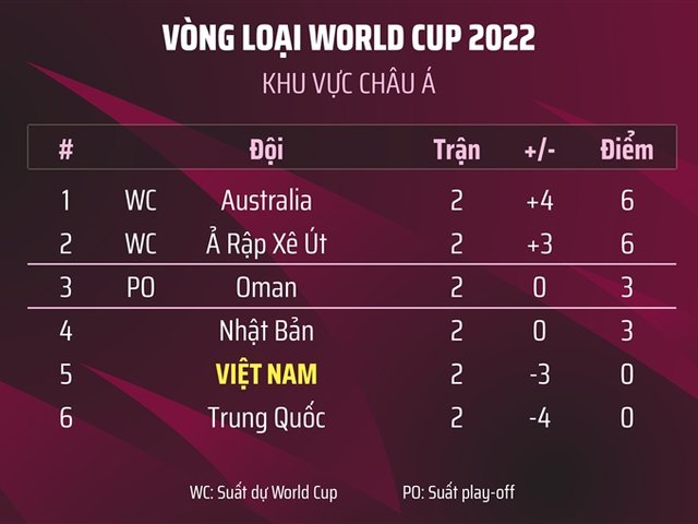 Bảng xếp hạng vòng loại World Cup 2022: Tuyển Việt Nam kém Trung Quốc 4 điểm