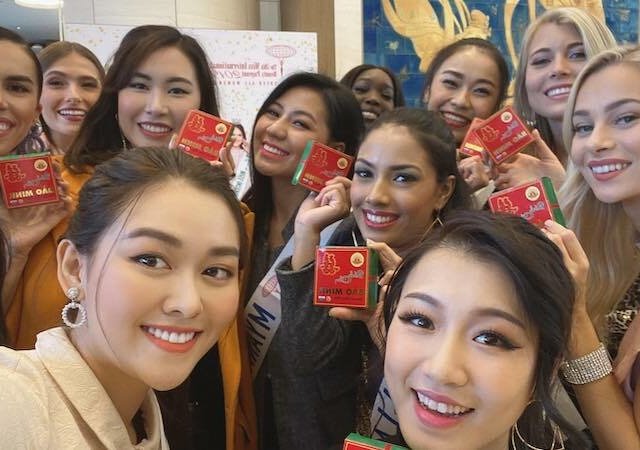 Á hậu Tường San mời các thí sinh Miss International 2019 thử bánh cốm - đặc sản Hà Nội.