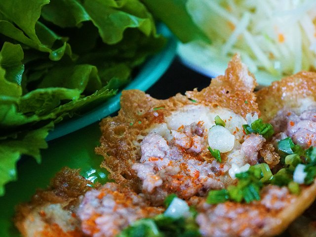 Miếng bánh giòn rụm, có vị thơm ngon được ăn kèm với rau sống và nước mắm chua ngọt.