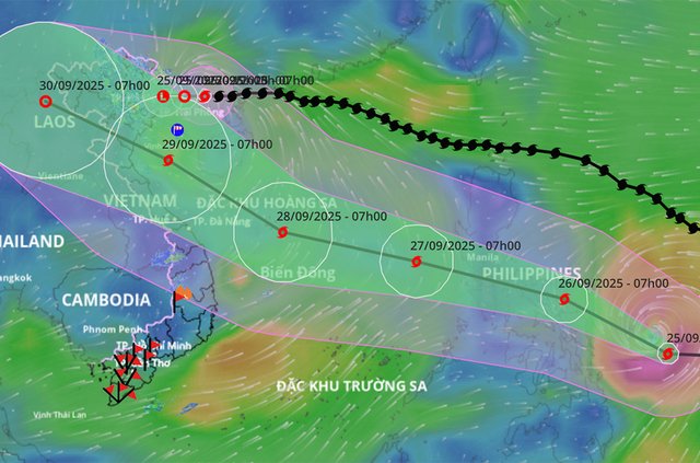 Lúc 1h hôm nay 26/9, bão Bualoi giật cấp 14, di chuyển nhanh với tốc độ 25-30km/h, dự báo đêm nay đi vào Biển Đông, sau đó khả năng mạnh thêm.