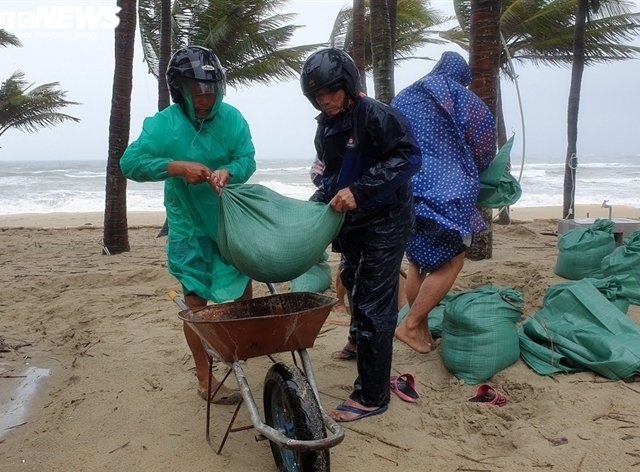 Người dân ven biển Hội An, tỉnh Quảng Nam đang căng mình gia cố bờ biển Cửa Đại trước sự công phá của sóng to, gió lớn do ảnh hưởng của bão số 5.