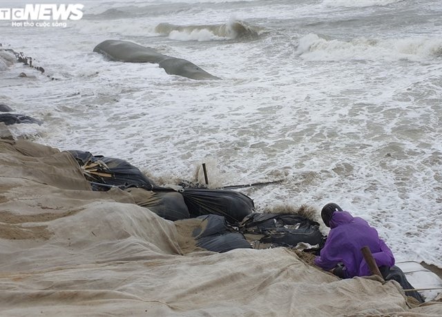 Ảnh: Mưa to, sóng lớn cuộn trào, người dân hối hả "vá" bờ biển Hội An