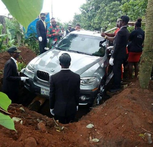 Người con trai ở Nigeria đặt bố bên trong chiếc xe BMW thay vì quan tài, bởi lúc sinh thời bố anh thích xe này mà không có.