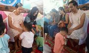 Vợ mất, người đàn ông Thái Lan mặc chiếc váy ren màu hồng, tóc kẹp nơ, cúi xuống mỉm cười hạnh phúc khi hai con trai dâng tặng tràng hoa.