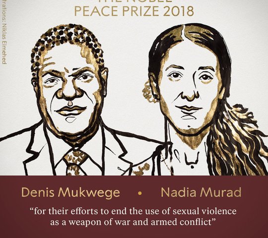 Ủy ban Nobel tại thủ đô Oslo-Na Uy hôm 5-10 công bố giải Nobel Hòa bình 2018 thuộc về ông Denis Mukwege và cô Nadia Murad vì nỗ lực chấm dứt bạo lực tình dục trong chiến tranh và xung đột vũ trang.